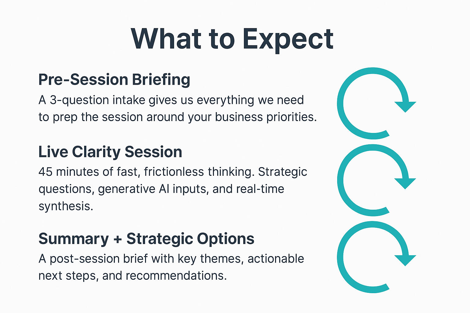 A: You’ll walk away with clarity, momentum, and a short PDF summary. You’ll also get options for continued collaboration — but there’s no obligation.